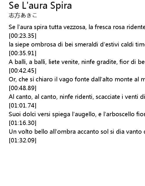 | [00:10.20] | Se l'aura spira tutta vezzosa, la fresca rosa ridente sta, |
