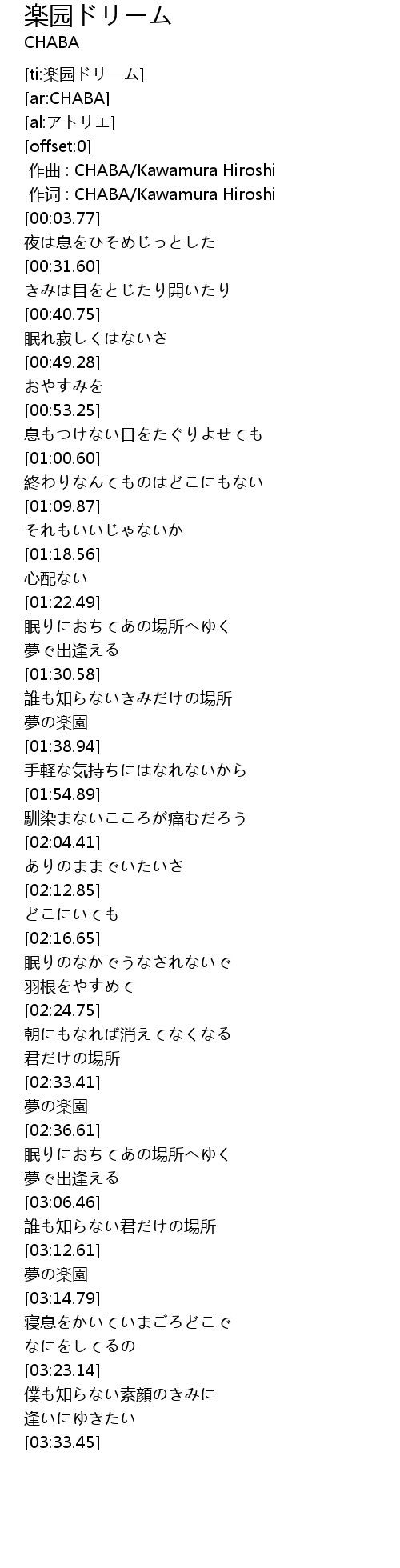 | [00:01.00] | 作词 : CHABA/Kawamura Hiroshi |