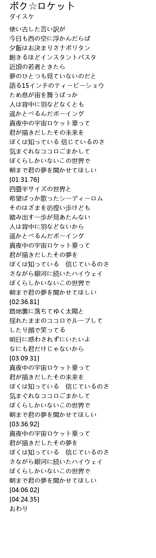 | [03:39.06] | 真夜中の宇宙ロケット乗って |