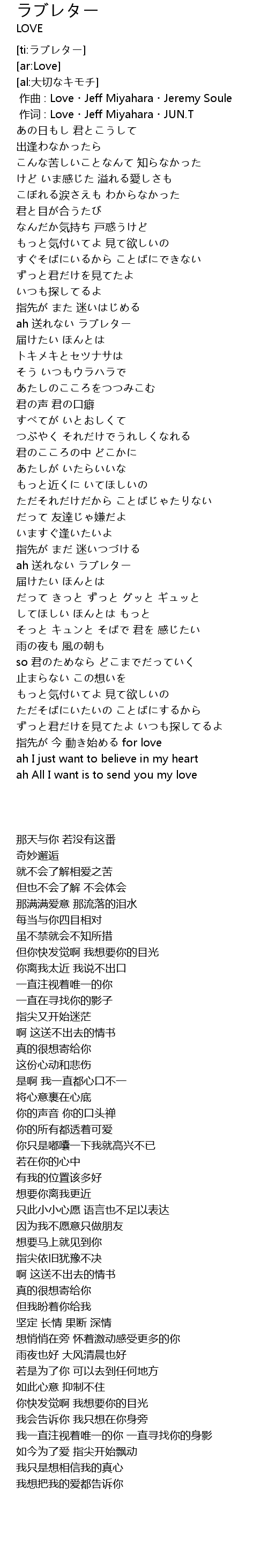 | [00:01.00] | 作词 : Love・Jeff Miyahara・JUN.T |