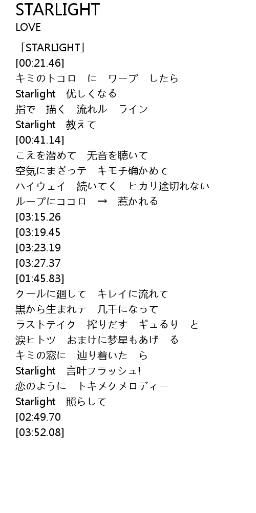 | [03:42.99][03:27.37][01:39.99] | Starlight 教えて |