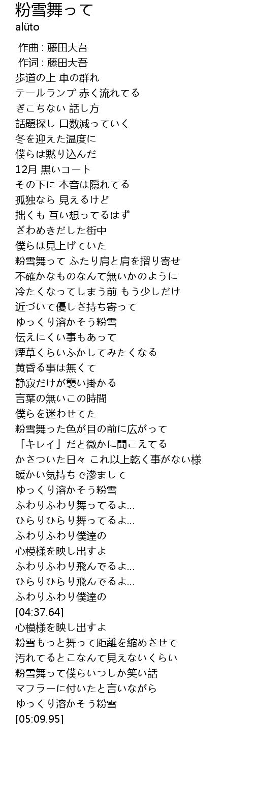 | [04:42.97] | 粉雪もっと舞って距離を縮めさせて |