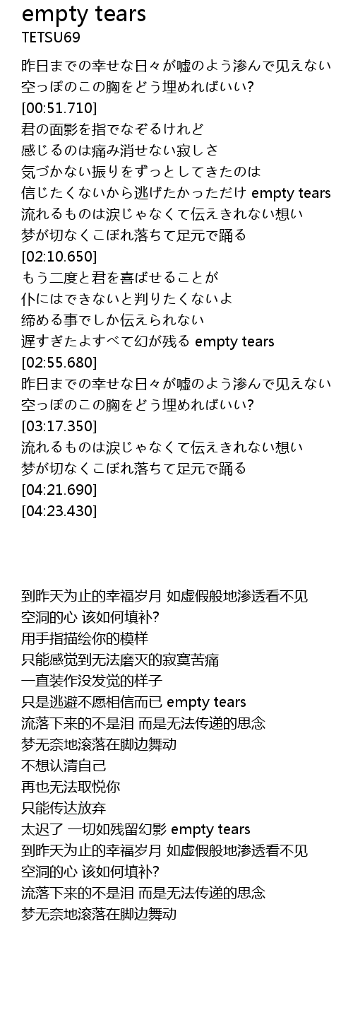 | [02:44.490] | 遅すぎたよすべて幻が残る empty tears |