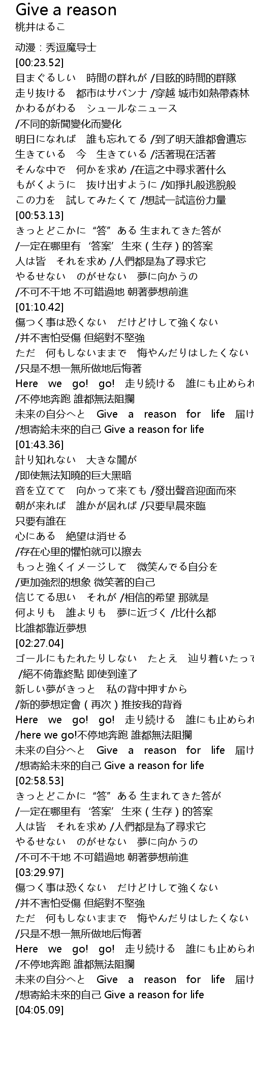 | [03:52.03] | 未来の自分へと Give a reason for life 届けたい /想寄給未來的自己 Give a reason for life |