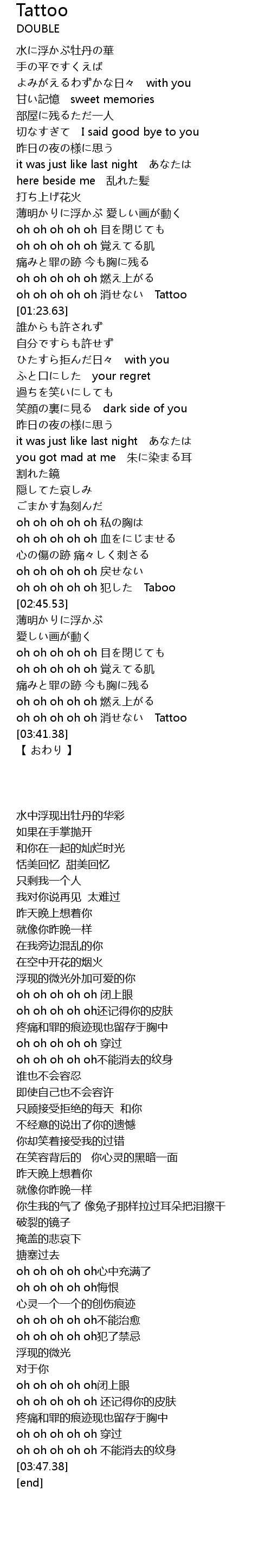 | [03:36.28] | oh oh oh oh oh 消せない Tattoo |