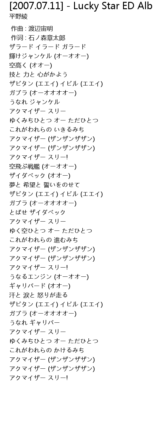 | Song | [2007.07.11] - Lucky Star ED Album - Aruhi no Karaoke Box - 14 - Aya Hirano - Shouri da! Akumaizer 3. |