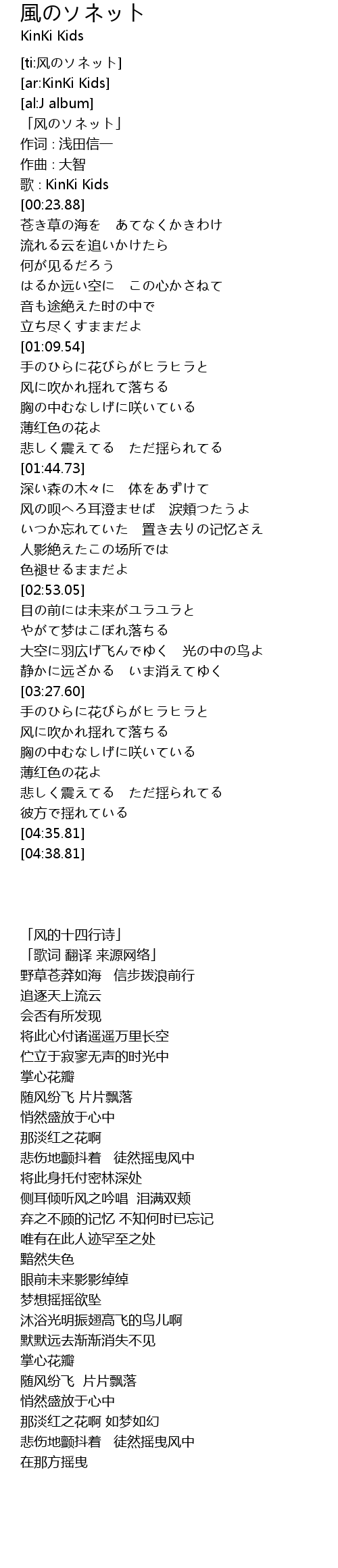 | [02:20.31] | 风の呗へろ耳澄ませば 涙頬つたうよ |