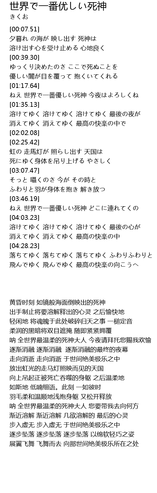 | [03:50.60] | ねえ 世界で一番優しい死神 どこに連れてくの |