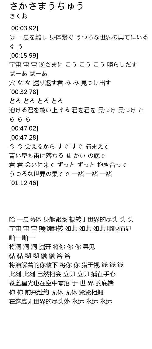 | [00:17.92] | 宇宙 宙 宙 逆さまに こう こう こう 照らしだす ぱーあ ぱーあ |