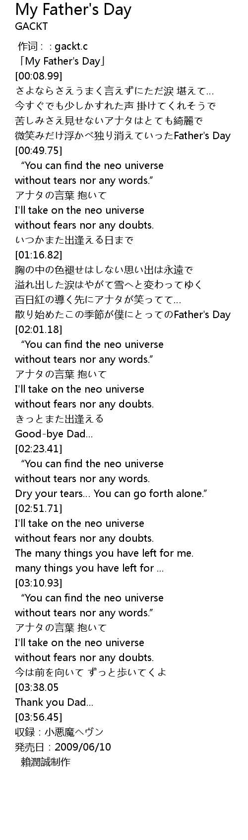 | [01:52.36] | 散り始めたこの季節が僕にとってのFather's Day |