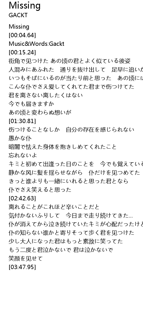 | [03:35.34] | もう二度と君泣かないで 君は泣かないで |