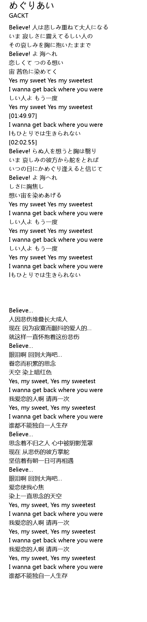 | [02:25.41] | Believe! らぬ人を想うと胸は翳り |