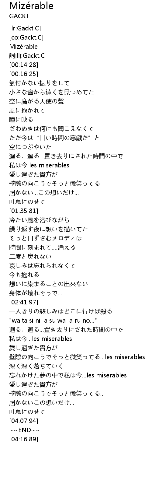 | [03:39.74] | 忘れかけた夢の中で私は今...les miserables |