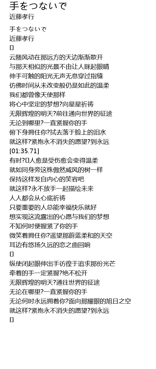 | [03:35.11] | 牵着的手一定紧握?绝不松开 |