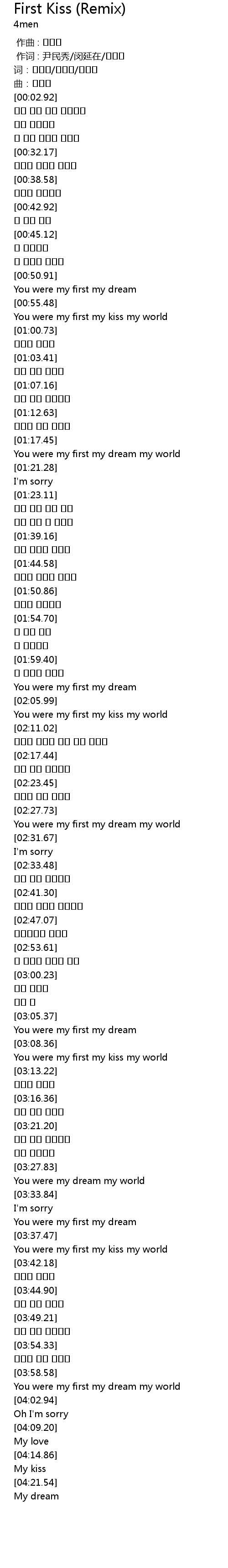 | [03:38.85] | You were my first my kiss my world |