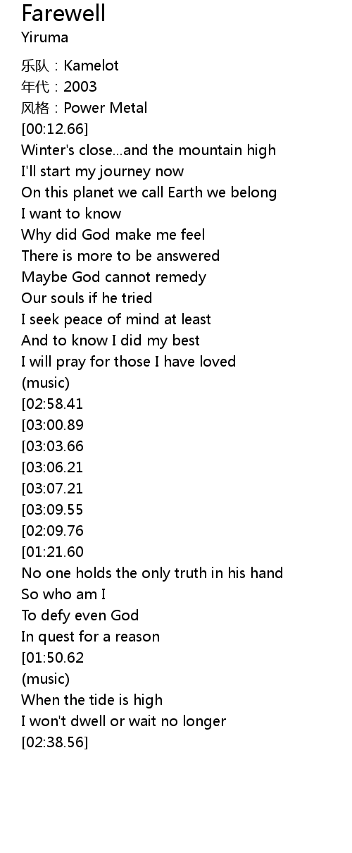 | [03:22.10][03:07.21][02:04.62][01:10.05] | I must take your farewell |
