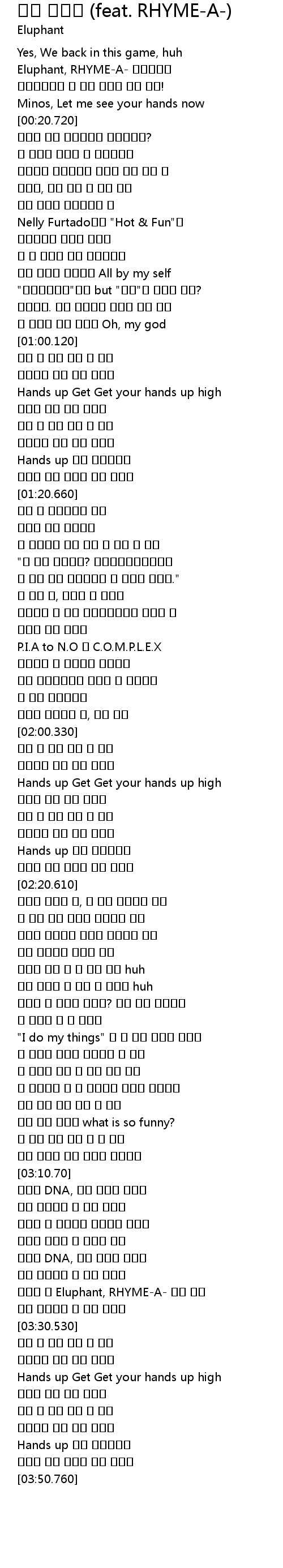 | [03:25.690] | 날개를 펴 Eluphant, RHYME-A- 다시 뭉쳐 |