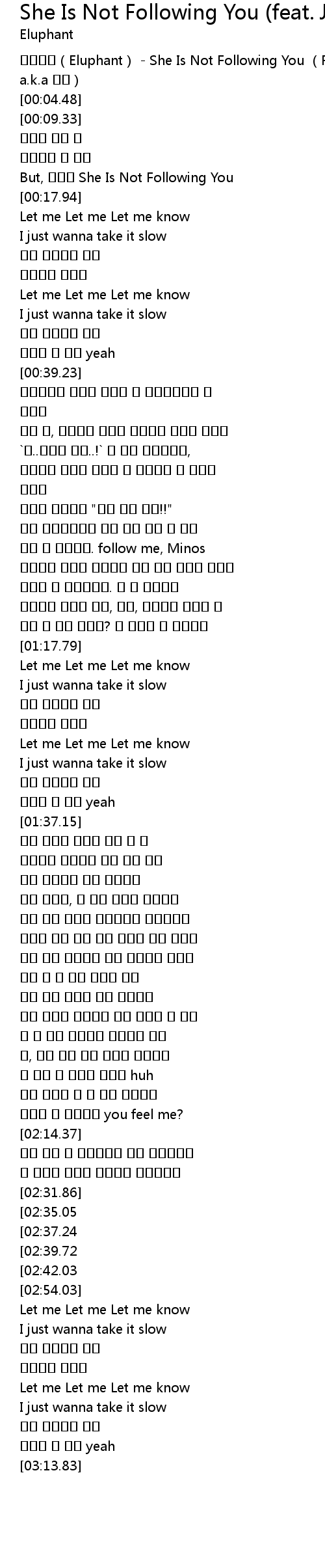 | [00:00.12] | 이루펀트(Eluphant) - She Is Not Following You (Feat. JC a.k.a 지은) |