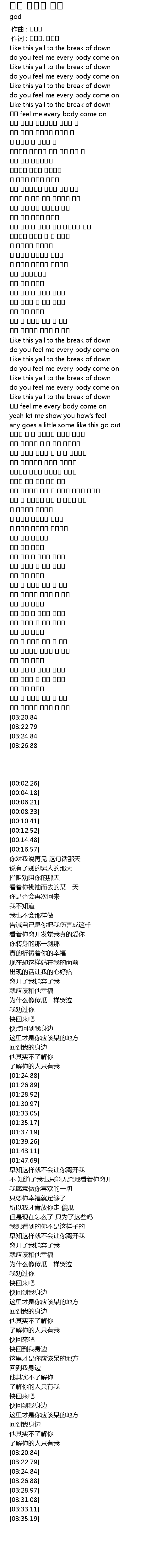 | [03:33.11][03:24.84] | Like this yall to the break of down |