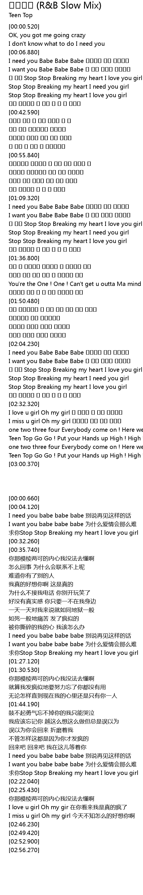| [02:04.420] | I need you Babe Babe Babe 안녕이란 말은 하지말아 |