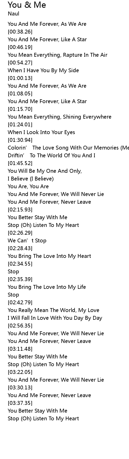 | [03:23.45] | You And Me Forever, We Will Never Lie |