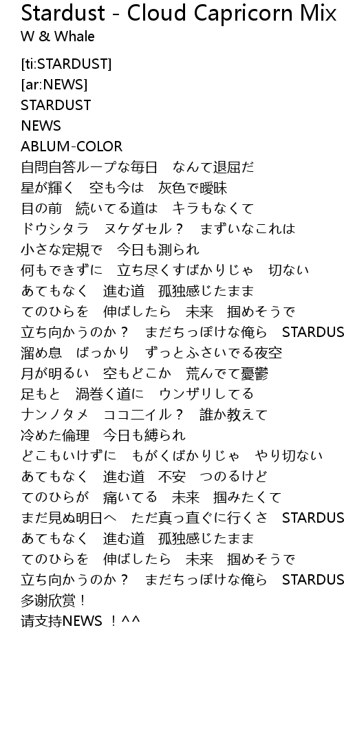 | [02:43.673] | まだ見ぬ明日へ ただ真っ直ぐに行くさ STARDUST Yeah |