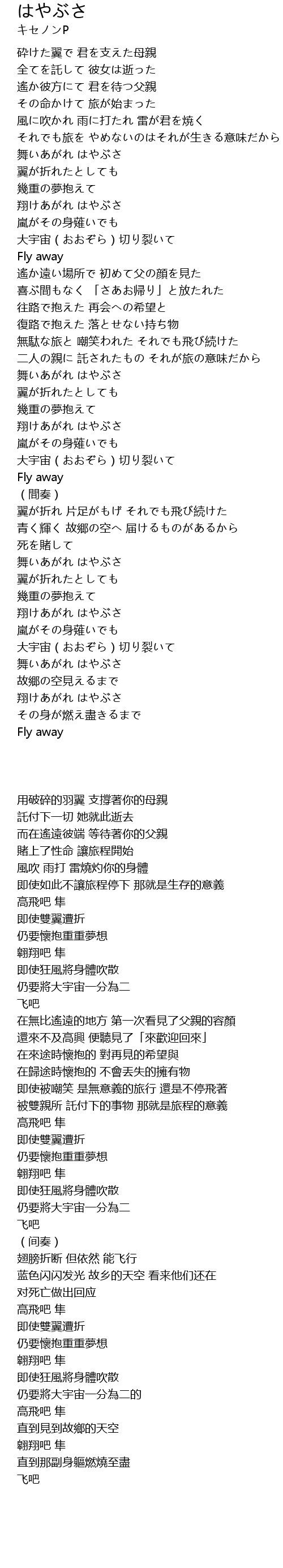 | [05:32.94] | 翼が折れ 片足がもげ それでも飛び続けた |