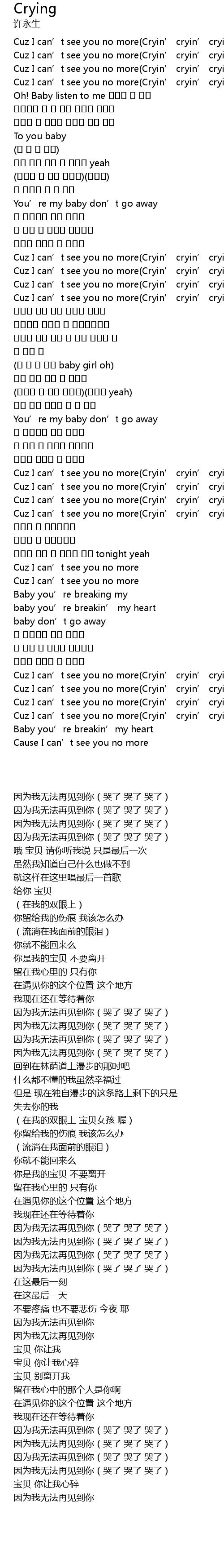 | [00:25.71] | Cuz I can' t see you no more Cryin' cryin' cryin' |