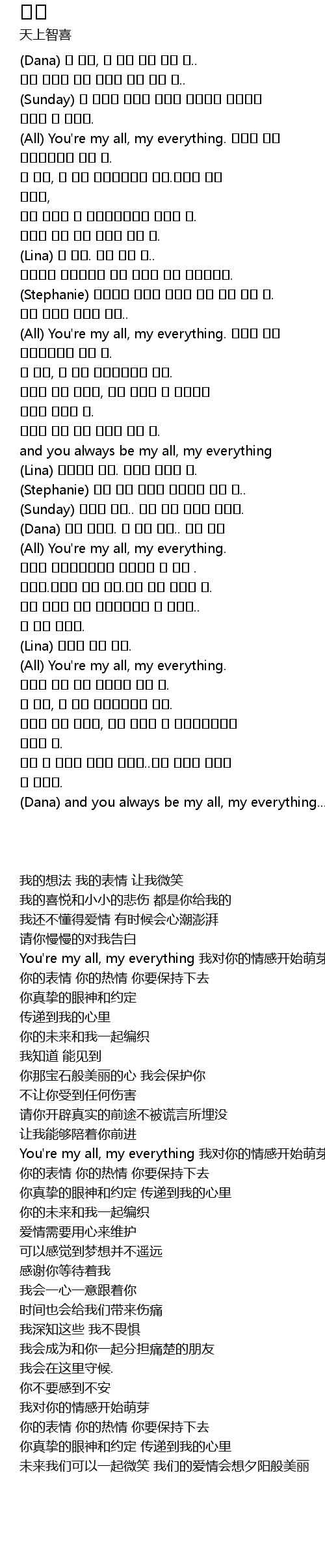 | [00:49.89] | (All) You're my all, my everything. 어렵지 않게 네가느껴지고 있는 걸. |