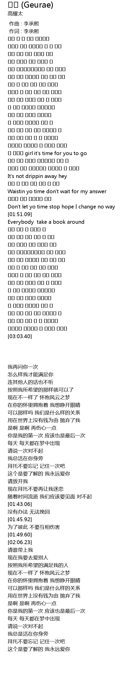 | [01:37.01] | 날 놓아줘 girl it's time for you to go |