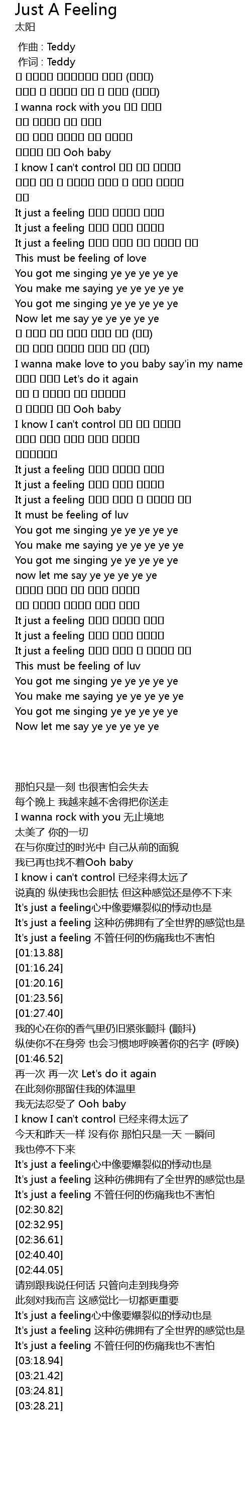| [02:17.46] | It just a feeling 가슴속 터질듯한 설렘도 |