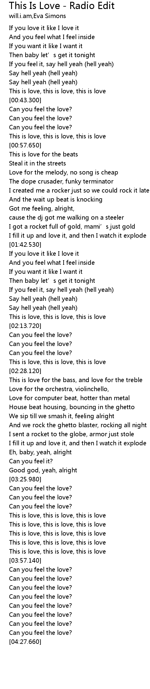 | [04:06.100] | Can you feel the love? |