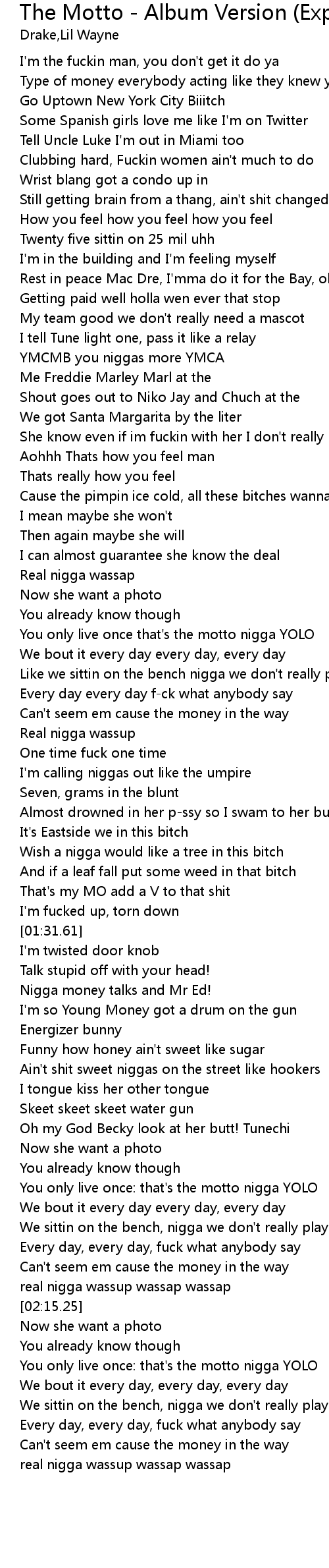 | [02:24.50] | You only live once: that's the motto nigga YOLO |
