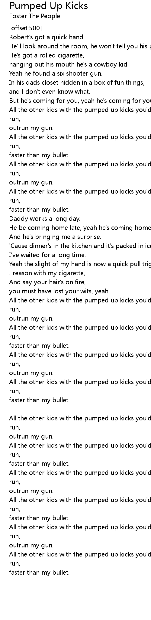 | [03:18.61] | All the other kids with the pumped up kicks you' d better run, better run, |