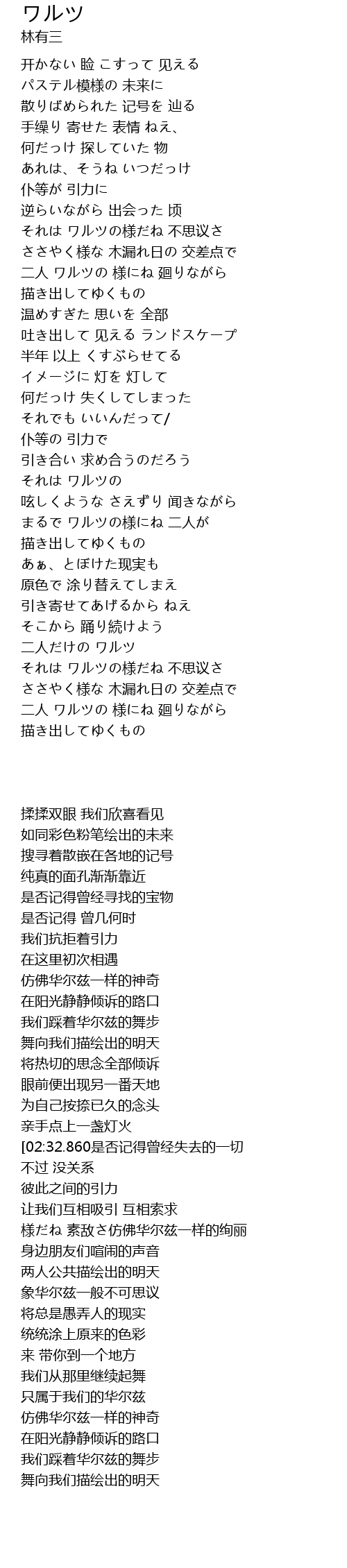 | [03:53.150] | それは ワルツの様だね 不思议さ |