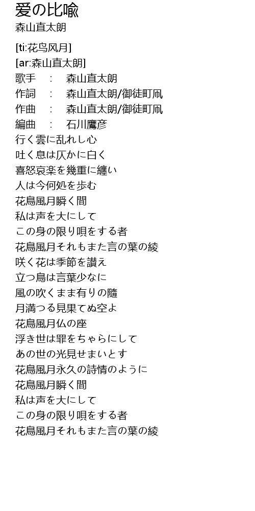 | [00:02.10] | 作詞 : 森山直太朗/御徒町凧 |