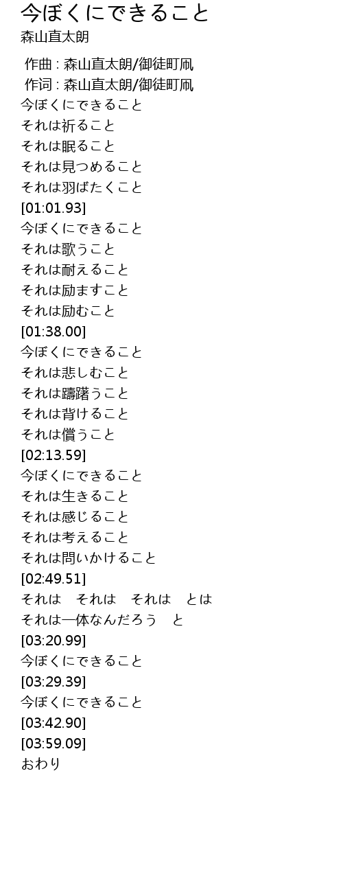 | [00:00.00] | 作曲 : 森山直太朗/御徒町凧 |