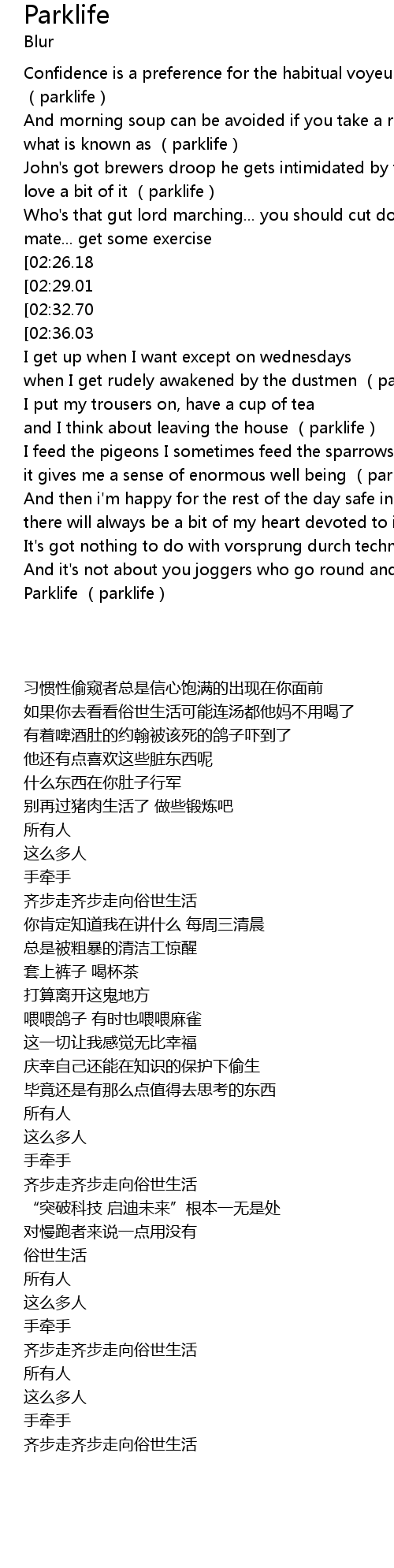 | [00:20.55] | Confidence is a preference for the habitual voyeur of what is known as (parklife) |