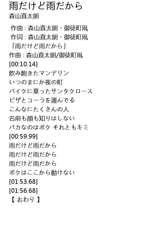 | [00:00.00] | 作曲 : 森山直太朗・御徒町凧 |