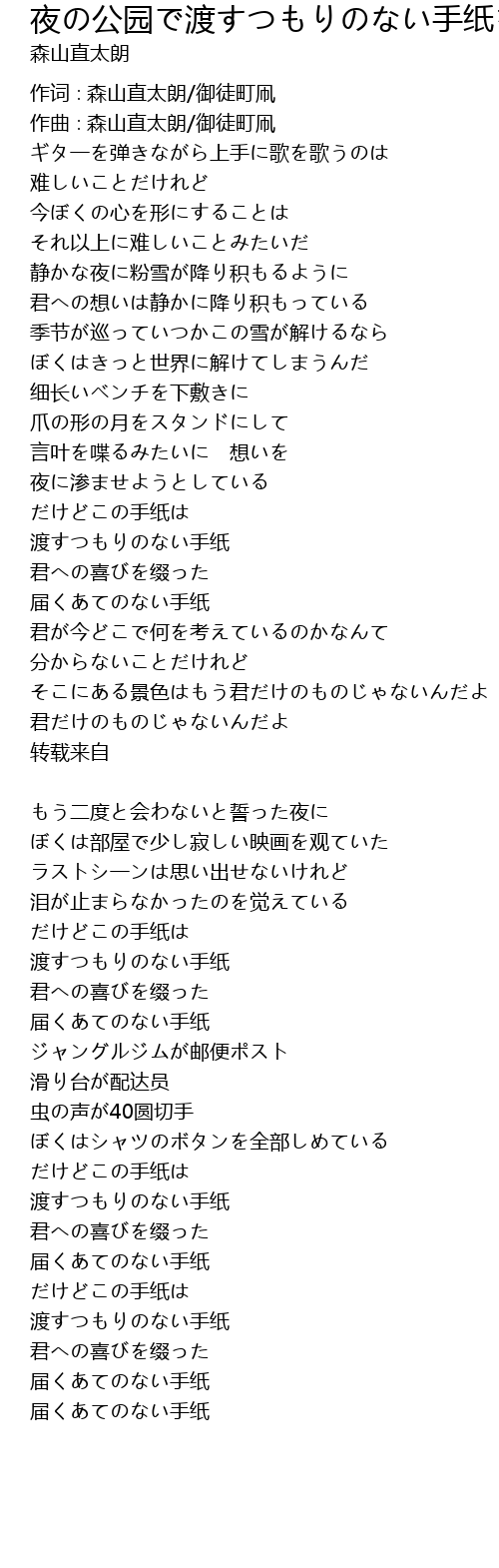 | Song | 夜の公园で渡すつもりのない手纸を书いている |