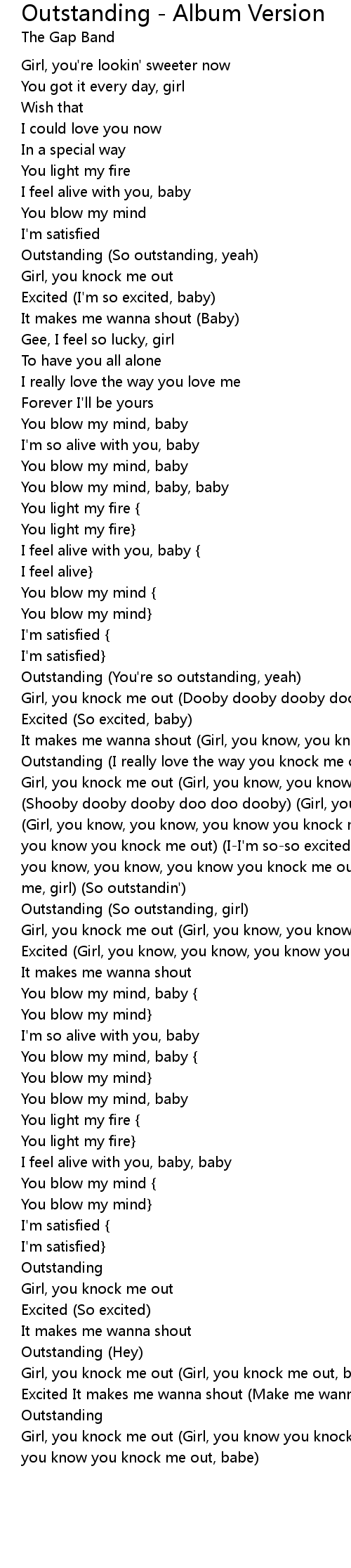 Girl, you knock me out (Girl, you know, you know, you know you knock me out) (Shooby dooby dooby doo doo dooby) (Girl, you knock me out) (So excited, baby) (Girl, you know, you know, you know you knock me out) (Girl, you know, you know, you know you knock me out) (I-I'm so-so excited) (So outstandin', baby) (Girl, you know, you know, you know you knock me out) (I really love the way you love me, girl) (So outstandin')