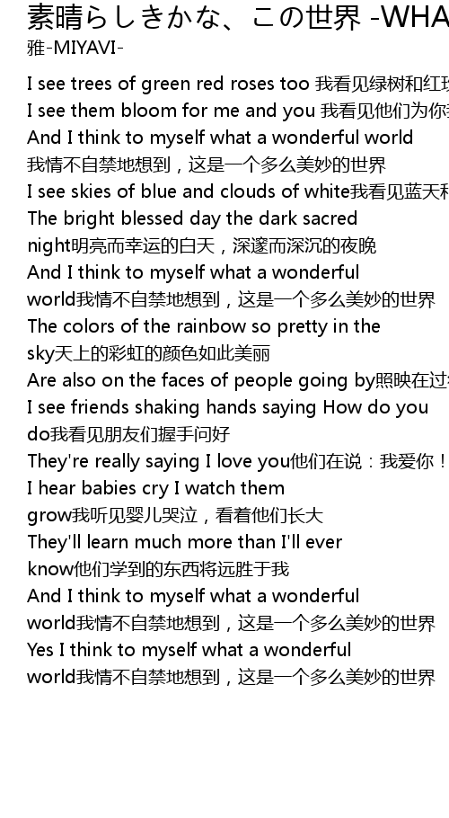 | [01:53.31] | Yes I think to myself what a wonderful world wo qing bu zi jin di xiang dao, zhe shi yi ge duo me mei miao de shi jie |