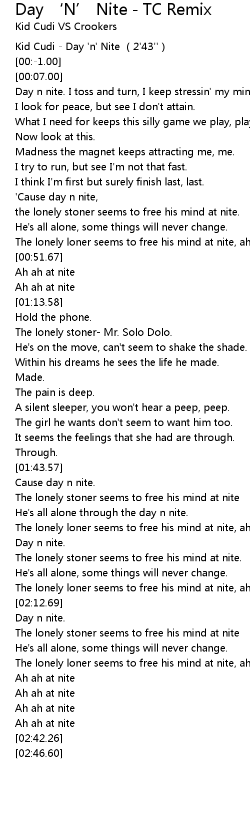 | [00:46.74] | The lonely loner seems to free his mind at nite, ah ah at nite. |