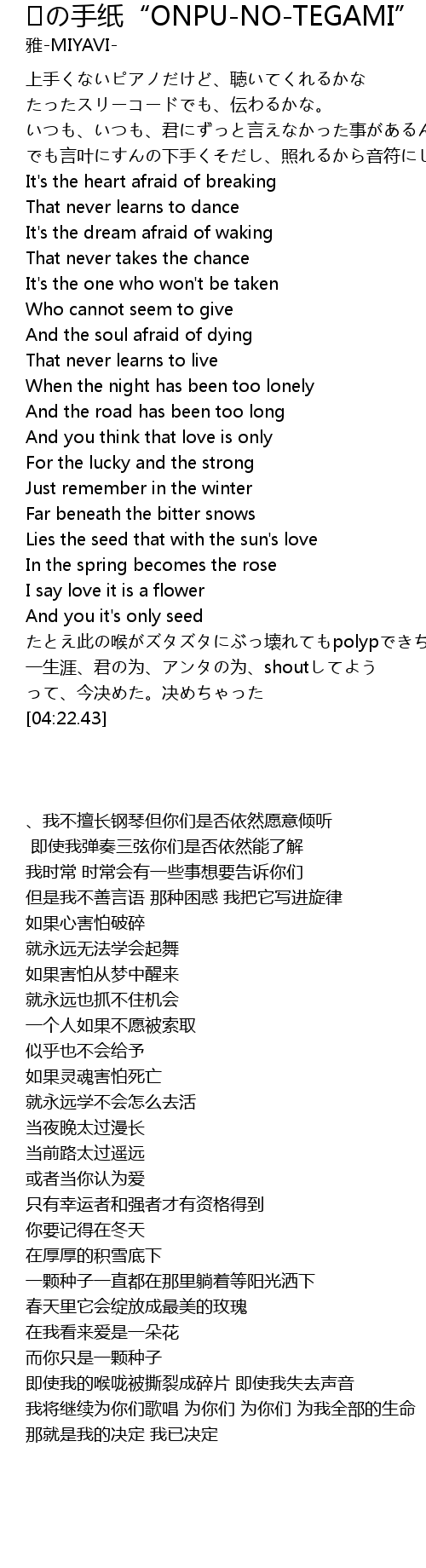 | [03:22.68] | たとえ此の喉がズタズタにぶっ壊れてもpolypできちゃっても |
