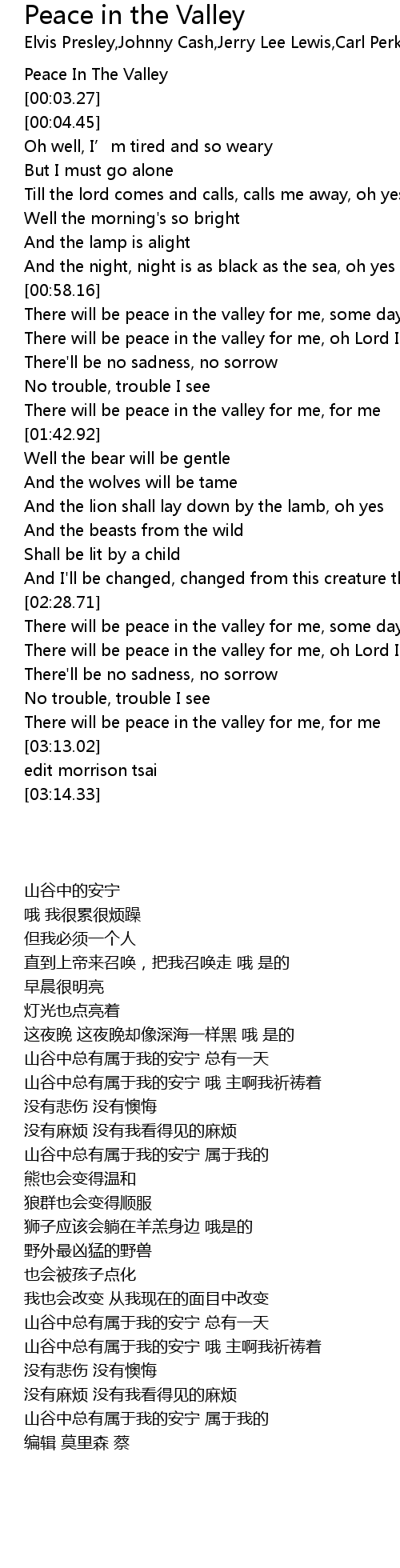 | [02:42.55] | There will be peace in the valley for me, oh Lord I pray |