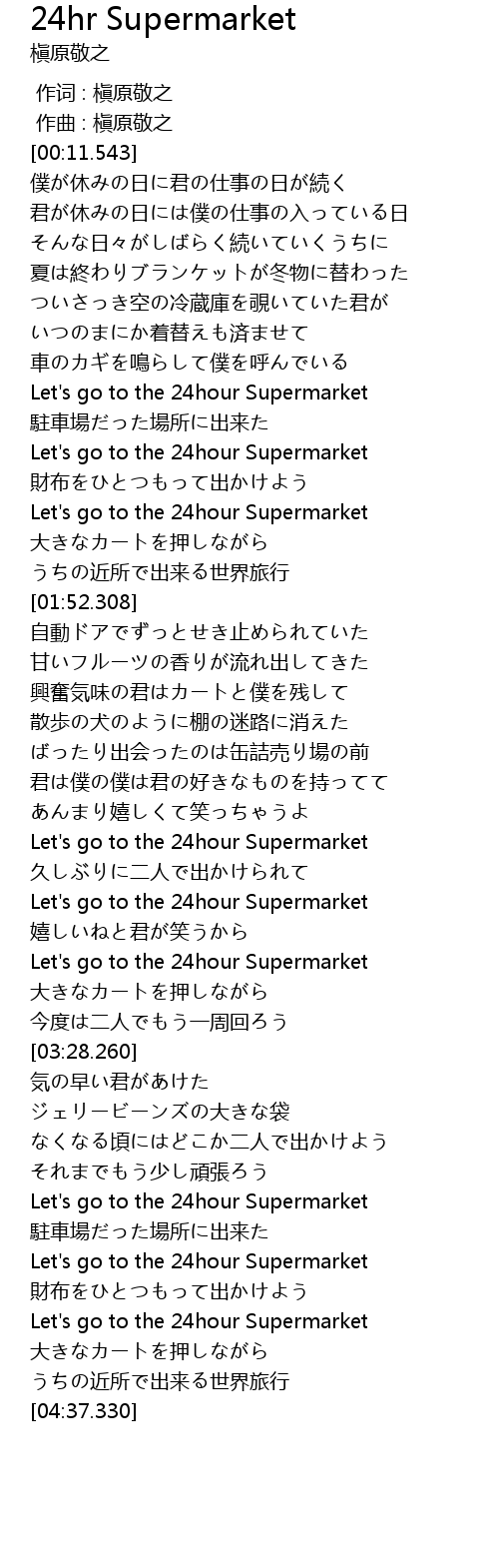 | [03:04.533] | Let' s go to the 24hour Supermarket |