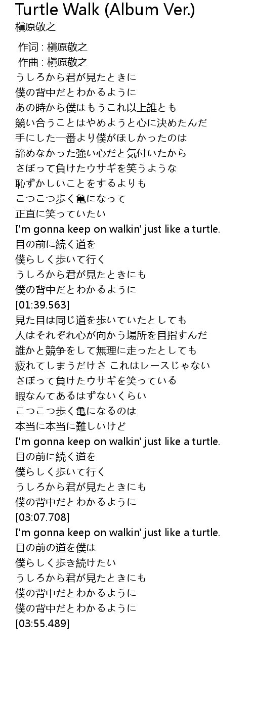 | [03:28.447] | I'm gonna keep on walkin' just like a turtle. |