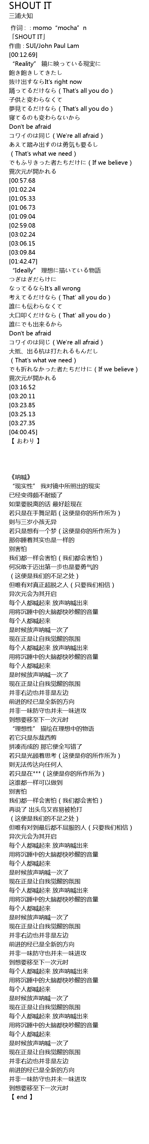 | [03:31.15][03:16.52][02:43.85][02:29.18] | SHOUT everybody, SHOUT it out loud |