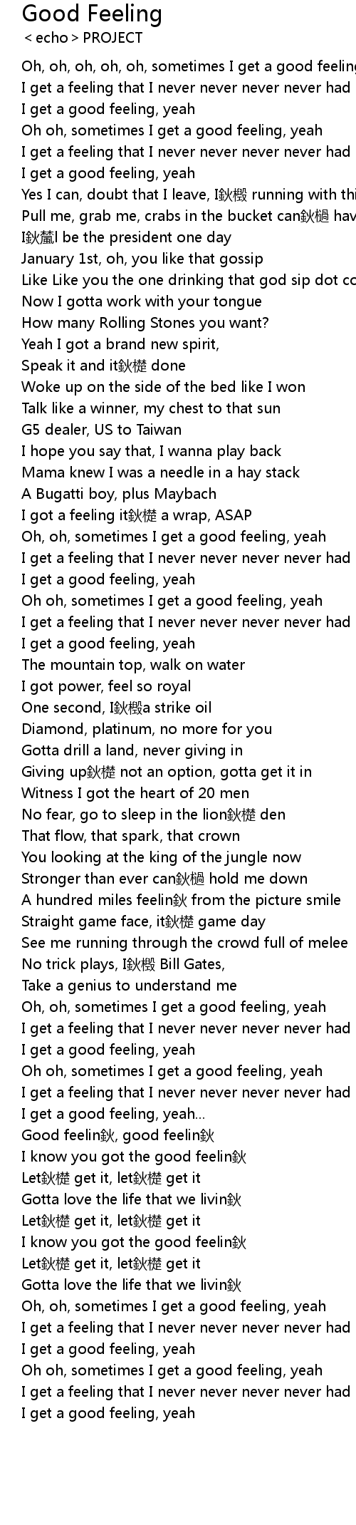 | [00:06.38] | Oh, oh, oh, oh, oh, sometimes I get a good feeling, yeah |