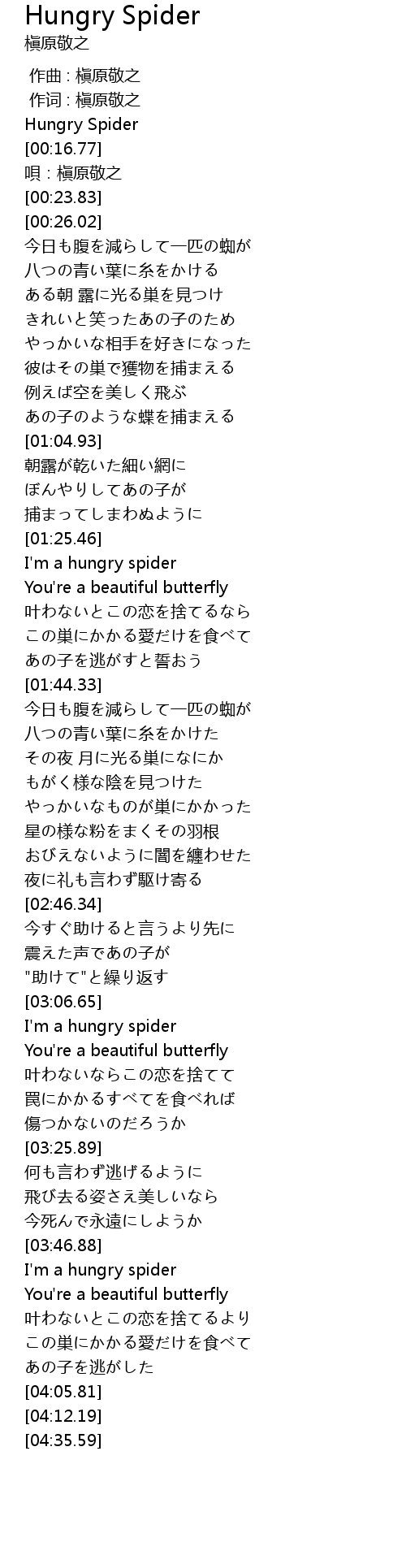| [00:28.03] | 今日も腹を減らして一匹の蜘が |